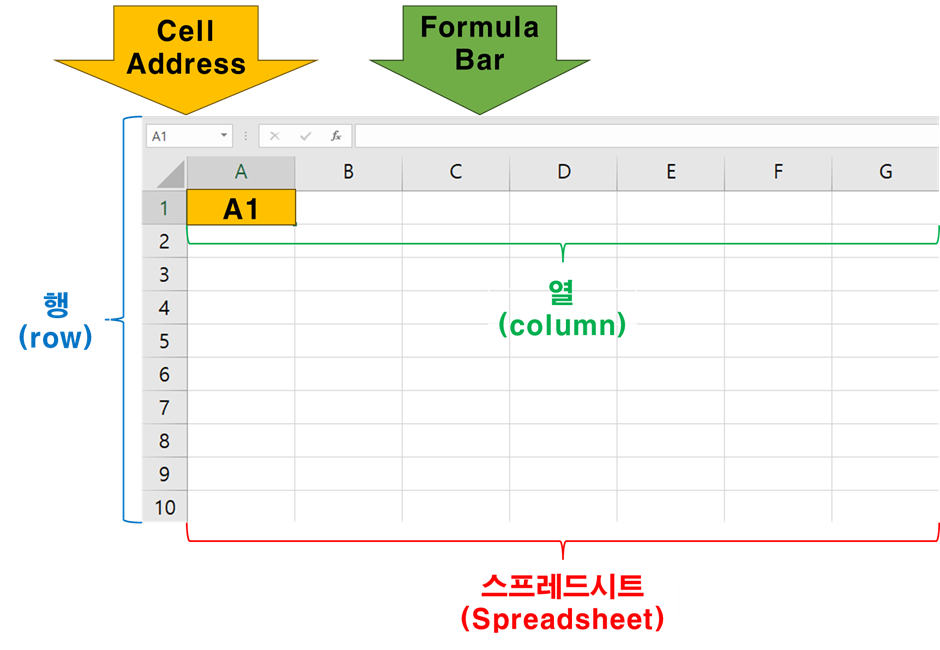 각각의 셀은 고유한 셀 주소를 가지며 이때 열은 주로 문자로, 행은 주로 숫자로 지정됩니다.