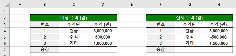 1. 예상 및 실제 수익 (월)의 총합 구하기 (SUM 함수를 사용합니다.)