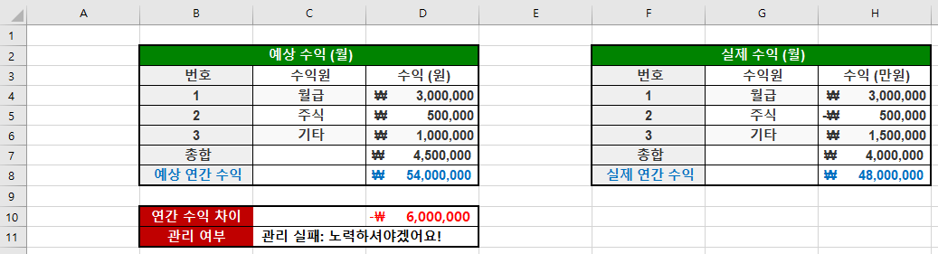4. IF 함수를 활용하여 연간 수익 차이가 0보다 클 경우 "관리 성공: 꾸준함이 답이다!", 0보다 작을 경우 "관리 실패: 노력하셔야겠어요!" 문구 나타내기