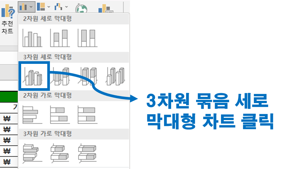 이후 삽입 탭의 "3차원 묶은 세로 막대형" 차트를 클릭합니다.