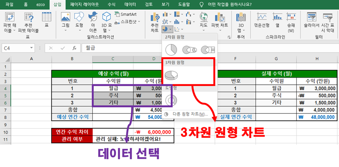 아래의 그림과 같이 수익원과 수익에 관한 셀을 선택하고 삽입의 "3차원 원형" 차트를 클릭합니다.