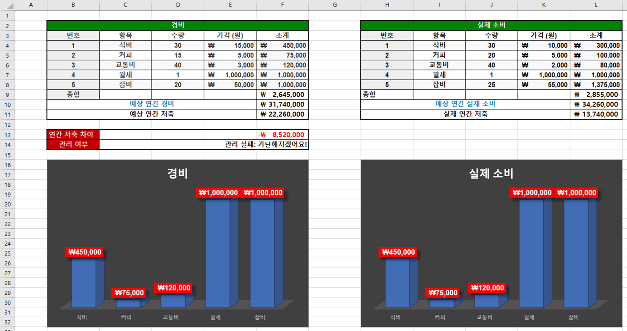 아래는 예시로 작성된 경비와 실제 소비 차트입니다.