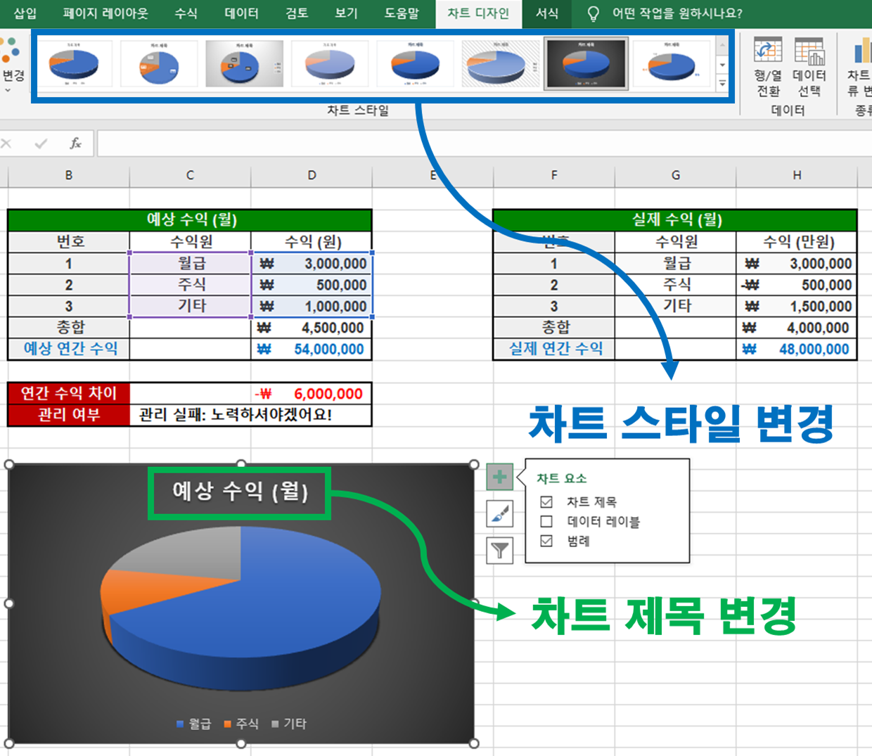 이후 차트 스타일 변경을 통해서 원하는 차트를 작성합니다.