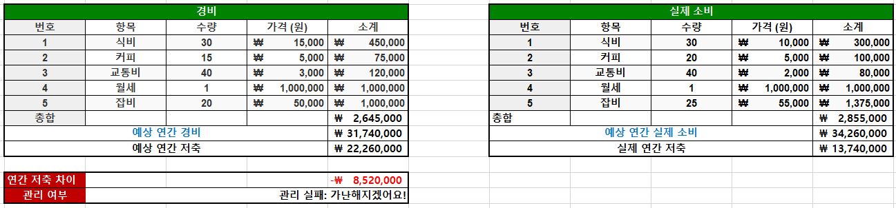 이후 아래와 같이 경비와 실제 지출 표에 대한 데이터를 입력합니다.