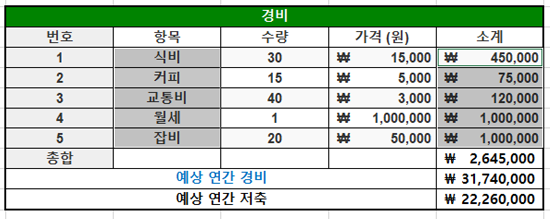 | 번호 | 항목 | 수량 | 가격 (원) | 소계 |