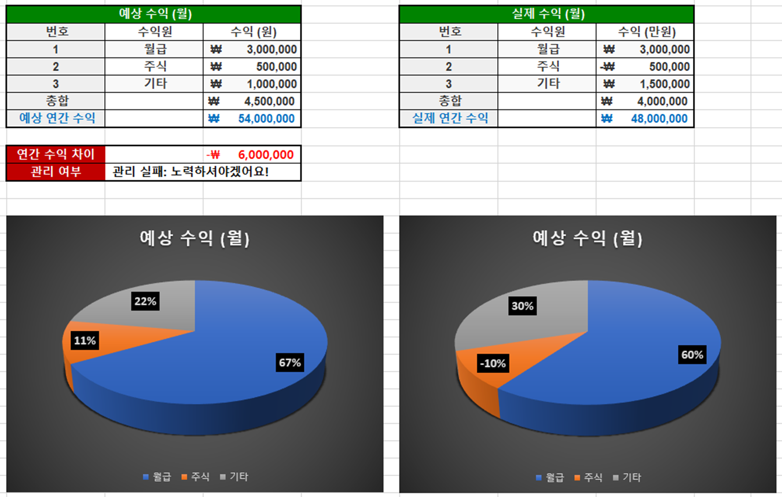 엑셀을 활용한 가계부 작성 (소득 및 경비)