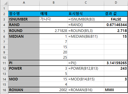 | MOD | 나눗셈의 나머지를 구합니다. | =MOD(B14,B15) |