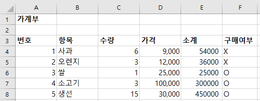 예시를 표현하기 위해서 가계부 F열에 "구매 여부" 항목을 아래 그림과 같이 추가하겠습니다.