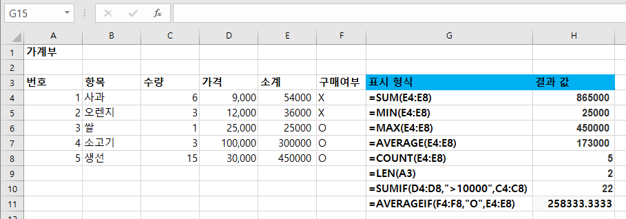 | AVERAGEIF | 특정 조건을 만족하는 셀의 평균을 계산합니다. | =AVERAGEIF(F4:F8,"O",E4:E8) |