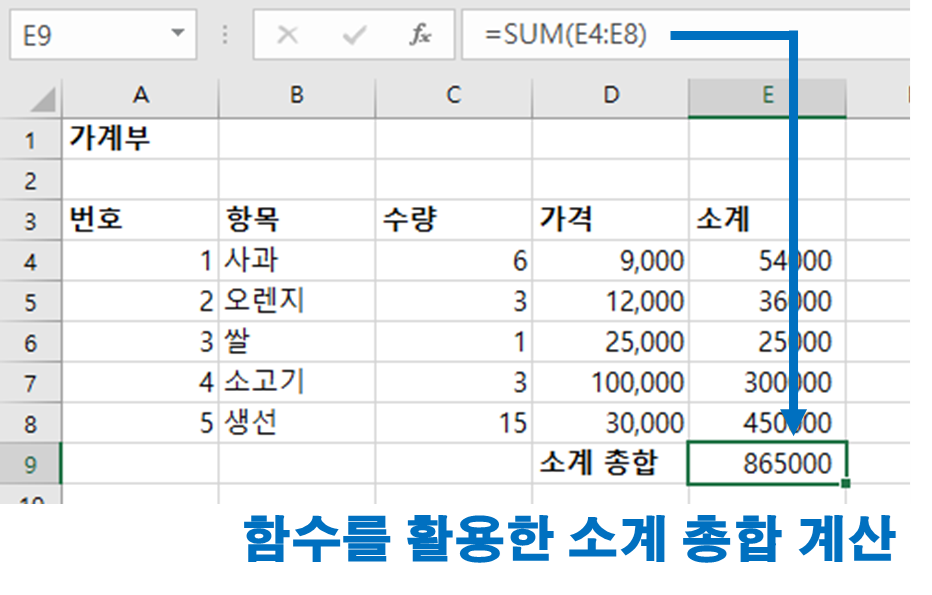 하지만, 만약 100개 혹은 1000개의 소계를 더하는 상황이라면 이렇게 수식을 사용하는 것은 매우 지치는 일이 될 것입니다.