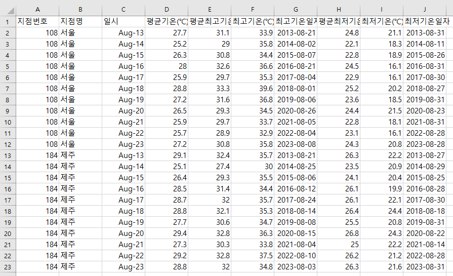 위 사이트의 데이터 중 오늘은 서울, 제주 여름의 최저, 평균, 최고기온에 대해서 알아보려고 합니다.