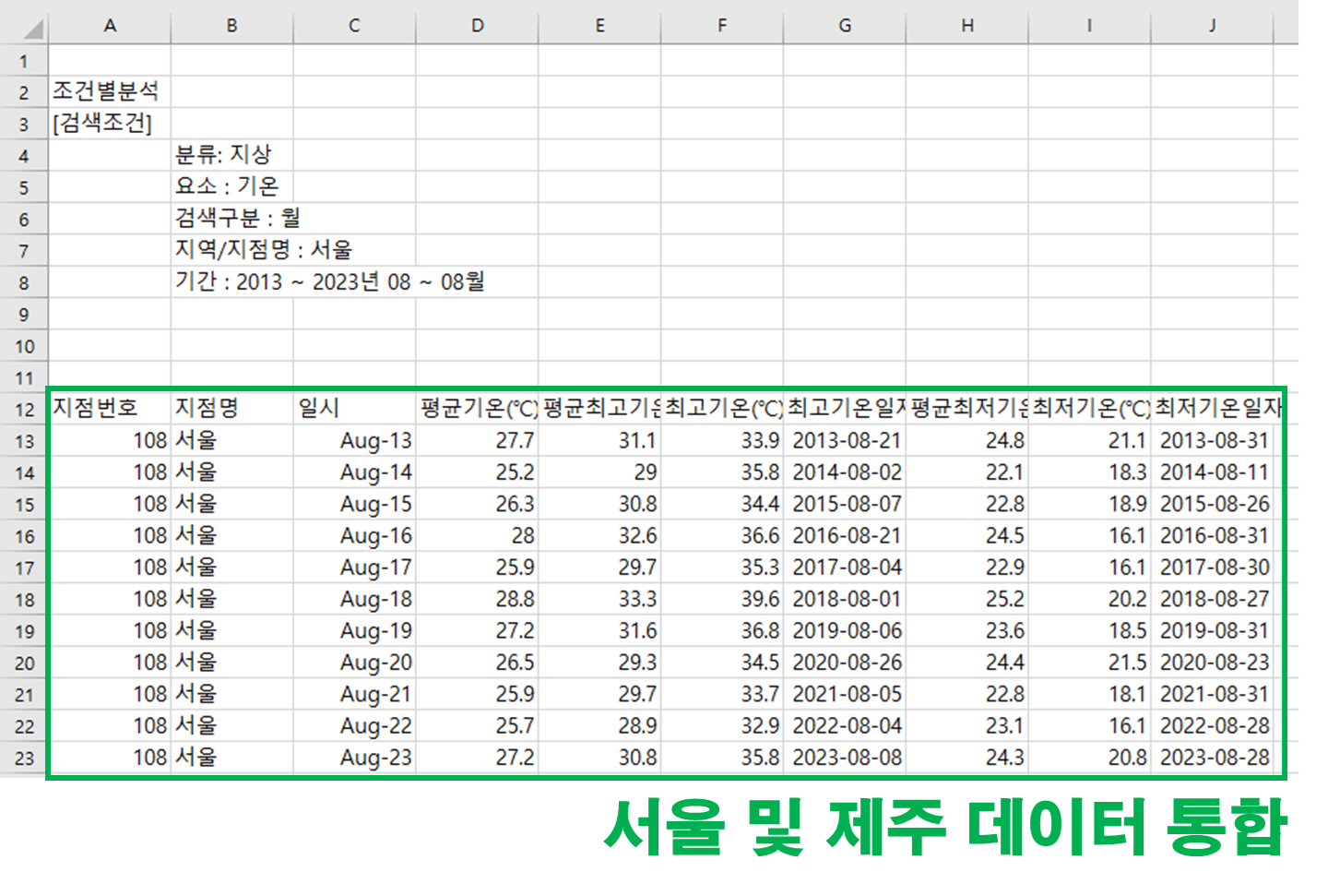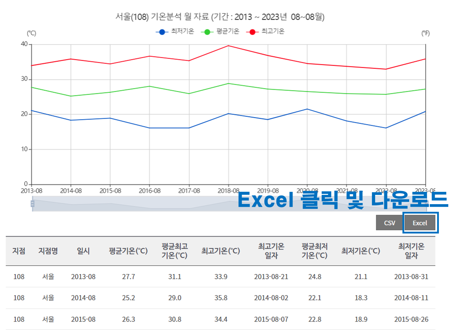 검색을 클릭하면 다음과 같이 2013 ~ 2023년도의 최저, 평균, 최고기온에 대한 자료가 표시됩니다.