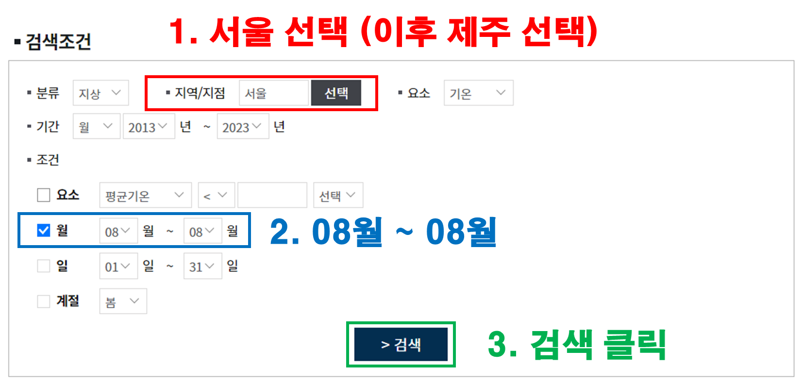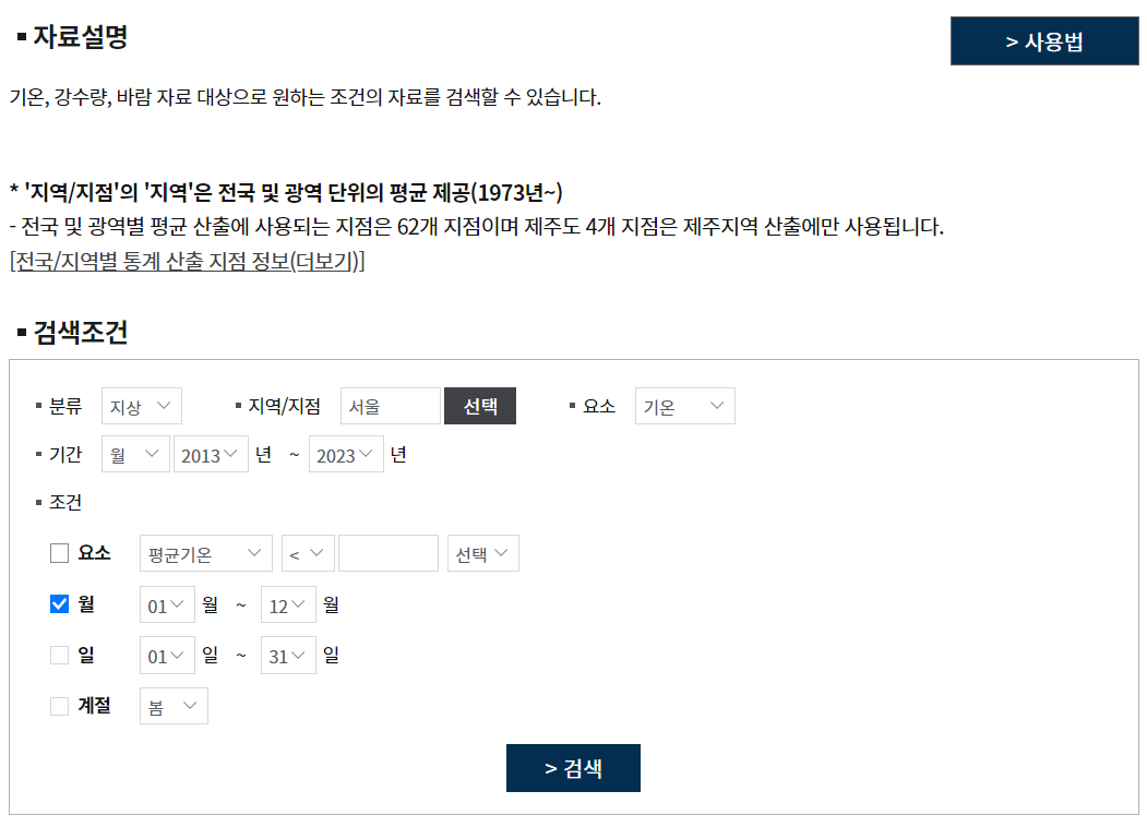 이때, 서울과 제주는 따로 데이터를 검색해야하므로 월을 먼저 설정하시고 지역/지점을 서울로 검색, 이후 제주로 검색하면 됩니다.