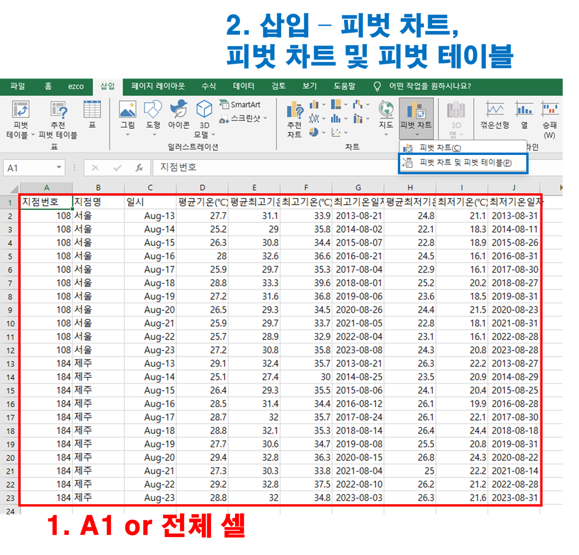 이번에 다룰 피벗 테이블은 기존에 다루던 데이터와 조금 다르지만 지역별 기온을 통해 알아볼까 합니다.