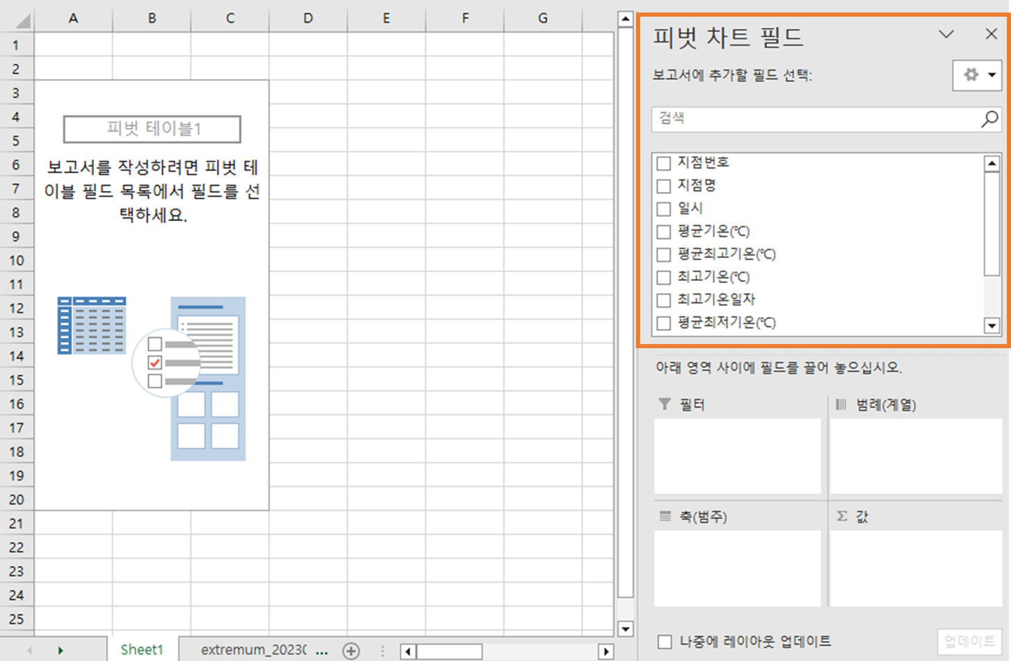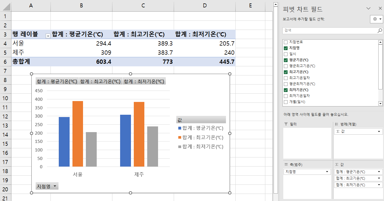이후 생선된 피벗 차트 필드에서 다음의 항목을 선택합니다.