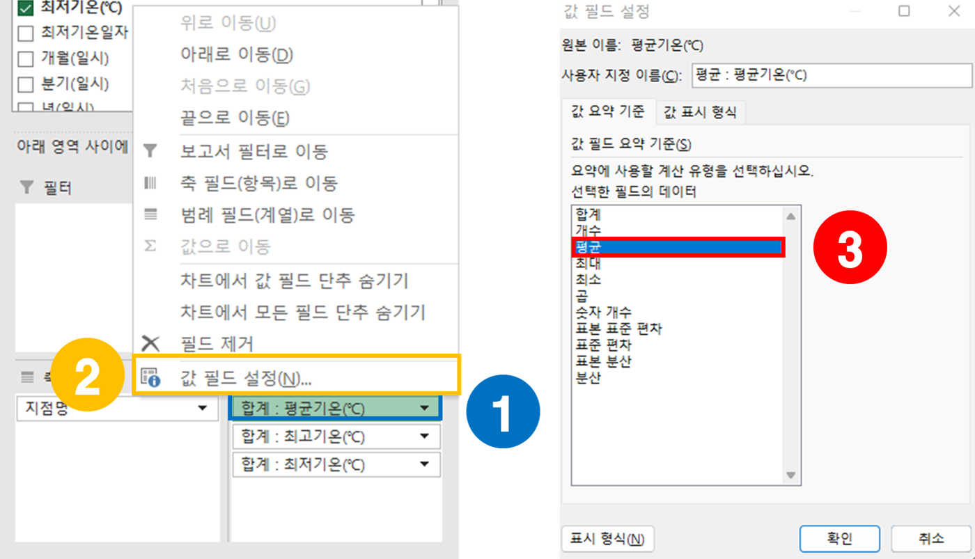 그렇기에 값에서 합계가 아닌 평균을 선택합니다.
