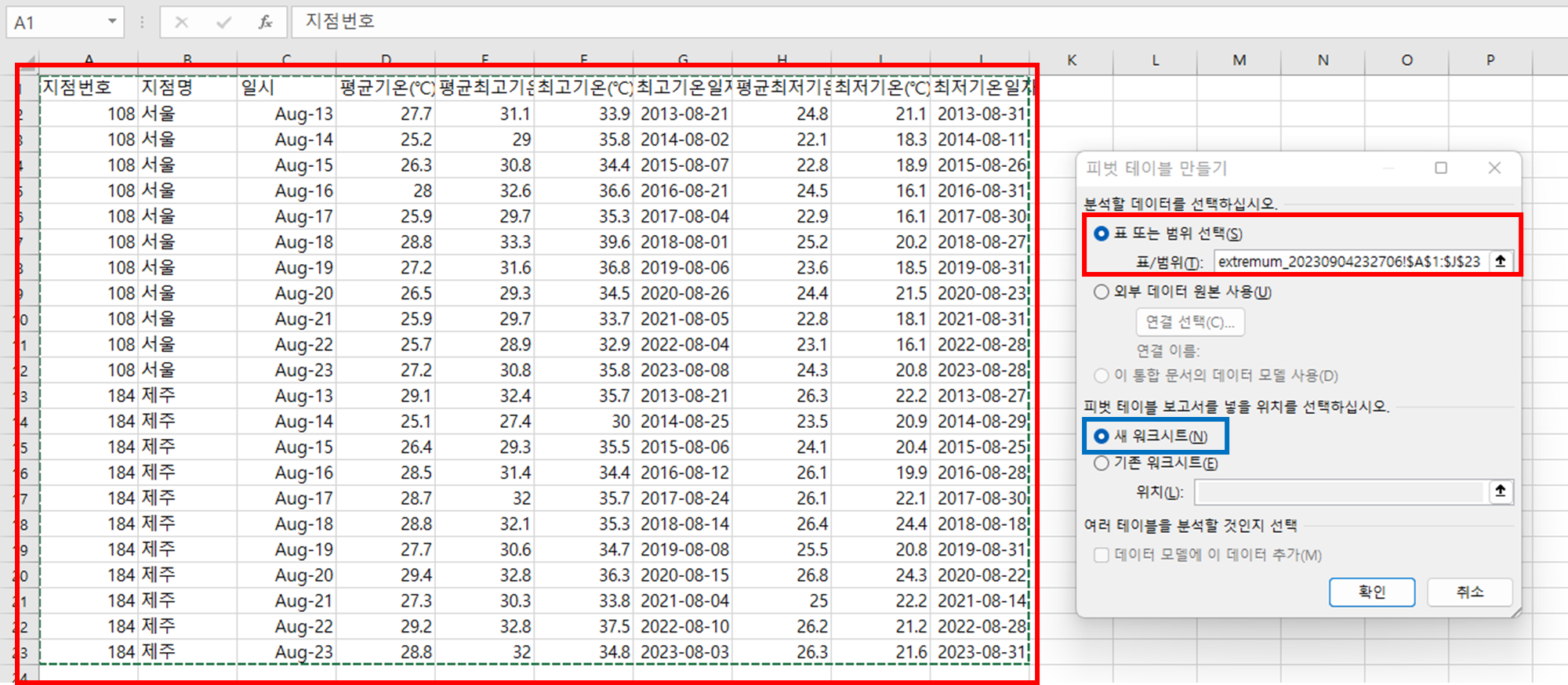 피벗 테이블 보고서를 넣을 위치: 새 워크시트