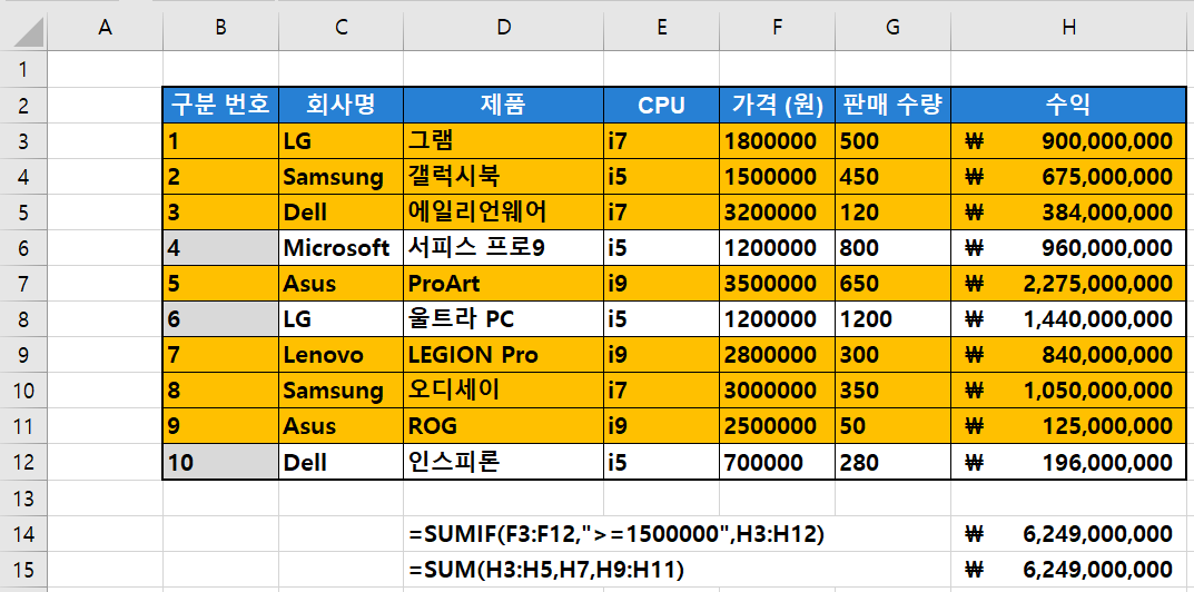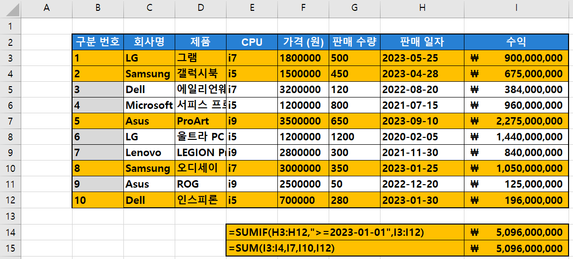 위의 조건을 토대로 SUMIF 함수를 사용하여 23년도 이후의 노트북 수익의 합산을 계산하였습니다.
