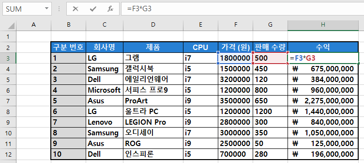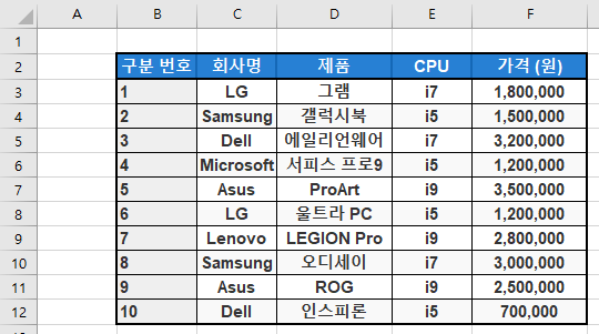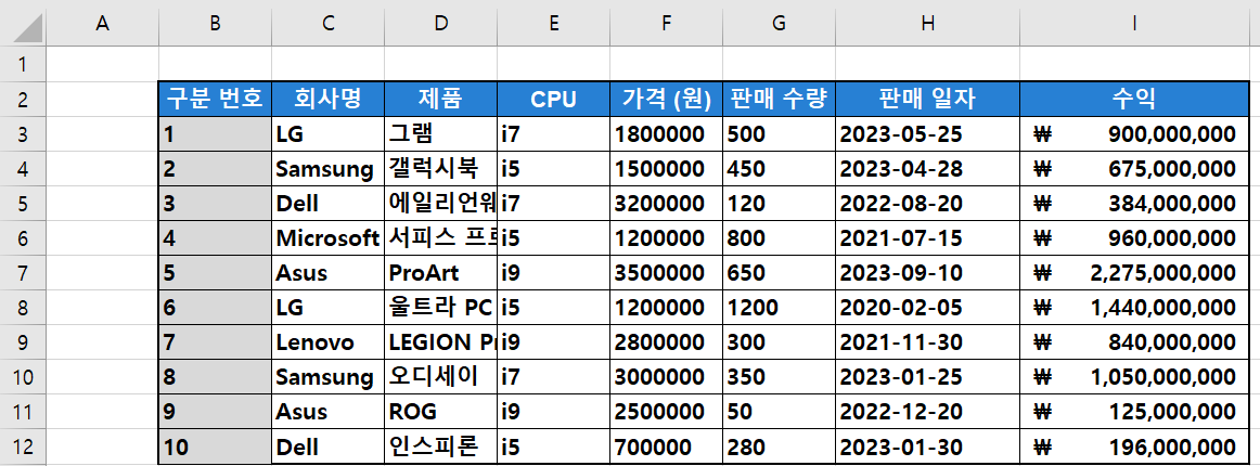 | 구분 번호 | 회사명 | 제품 | CPU | 가격 (원) | 판매 수량 |