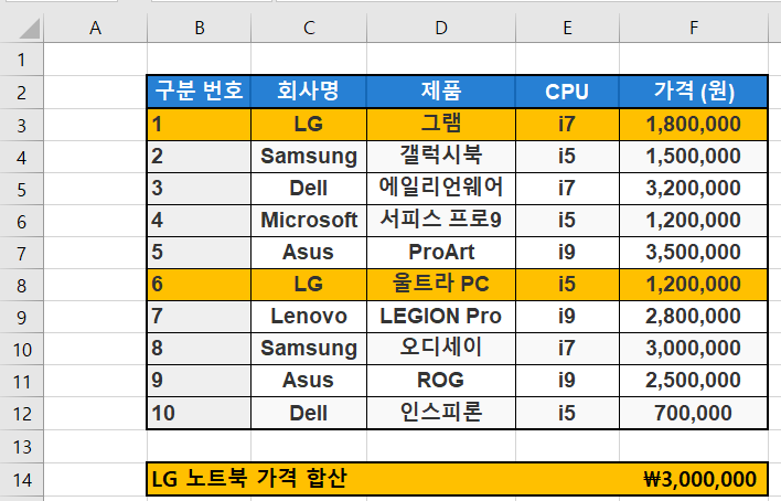 예를 들어 LG 회사명이 포함된 "그램", "울트라 PC"의 가격 합산을 계산해보겠습니다.