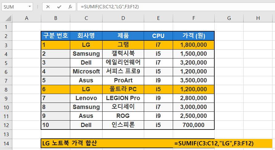예를 들어 LG 회사명이 포함된 "그램", "울트라 PC"의 가격 합산을 계산해보겠습니다.